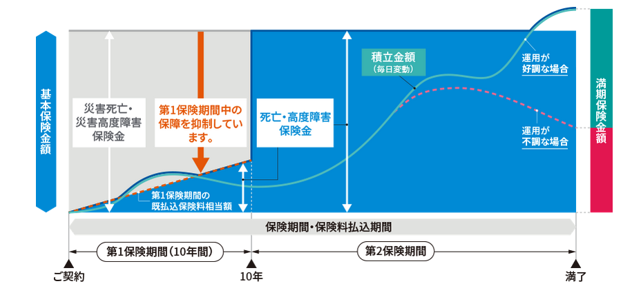 10年間は死亡保障が抑制されており、第2保険期間に入ると基本保険金額があるので通常の死亡保険と遜色ない保障を得ることができます。また、積立金は毎日運用されておりその成績によって満期保険金や死亡保険金の額が変わります。特にこの保険で契約者が気になるのが満期保険金ではないでしょうか。
