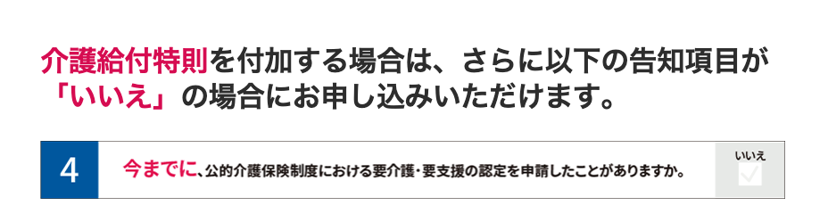 こちらには介護の保障をつけることができるのですが、そちらも1つ告知を追加するだけで加入できます。
