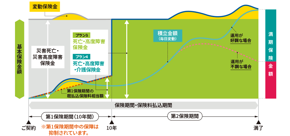 しかし、この期間を設けることで保障では運用を効率よくおこなうことを重視することができます。また災害死亡・災害高度障害保険金は第2保険期間の基本保険金額と同額受け取ることが可能です。10年目以降は通常の変額保険同様に死亡保障を受け取ることができます。また、運用成績次第で満期保険金を増やすことも可能です。